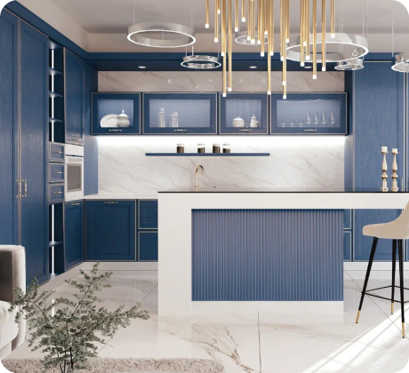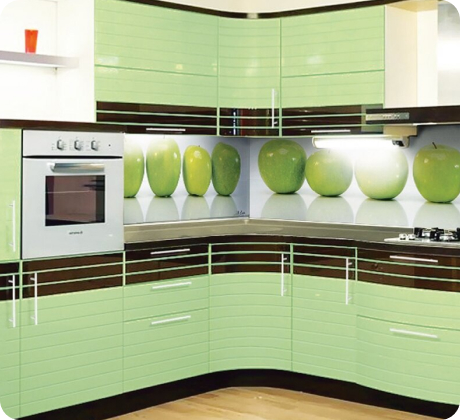 - Широкая палитра глянцевых фасадов: аквамариновый, белый глянец, ярко‑жёлтый, красный, мятный, оливковый, оранжевый, фиалковый, сиреневый, шоколадный и другие популярные оттенки.