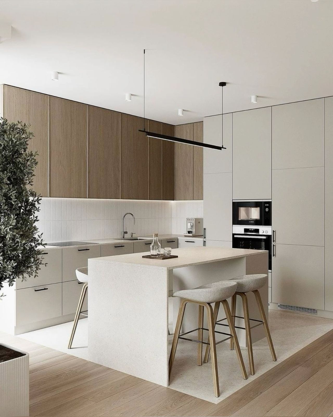 - Чистые линии — ровные фасады, аккуратные стыки, лаконичные решения.